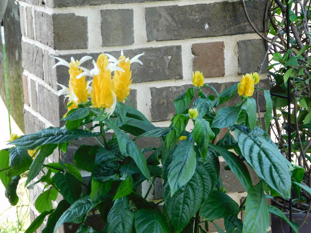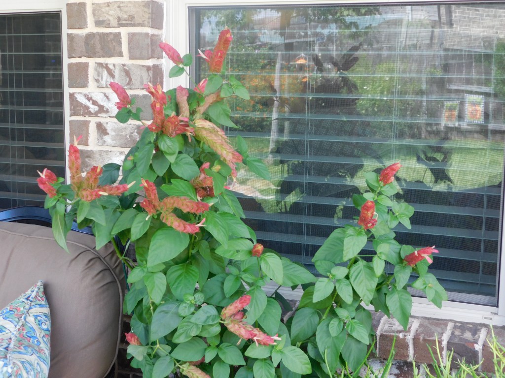 I am not a talented enough photographer to catch hummingbirds in flight. All I get is a blurry image of bright, shimmery green as they zoom by! But, the experience of just watching them as they play and interact with each other is simply mesmerizing. They frolic among the trees and plants, dive-bombing as they fly so close to each other that it is a wonder they don’t collide! The near misses sound like bees buzzing in the flowers. They have also been very interested in the Shrimp plants lately. They dip their long tongues into the graceful Shrimp plant blooms to take a drink.