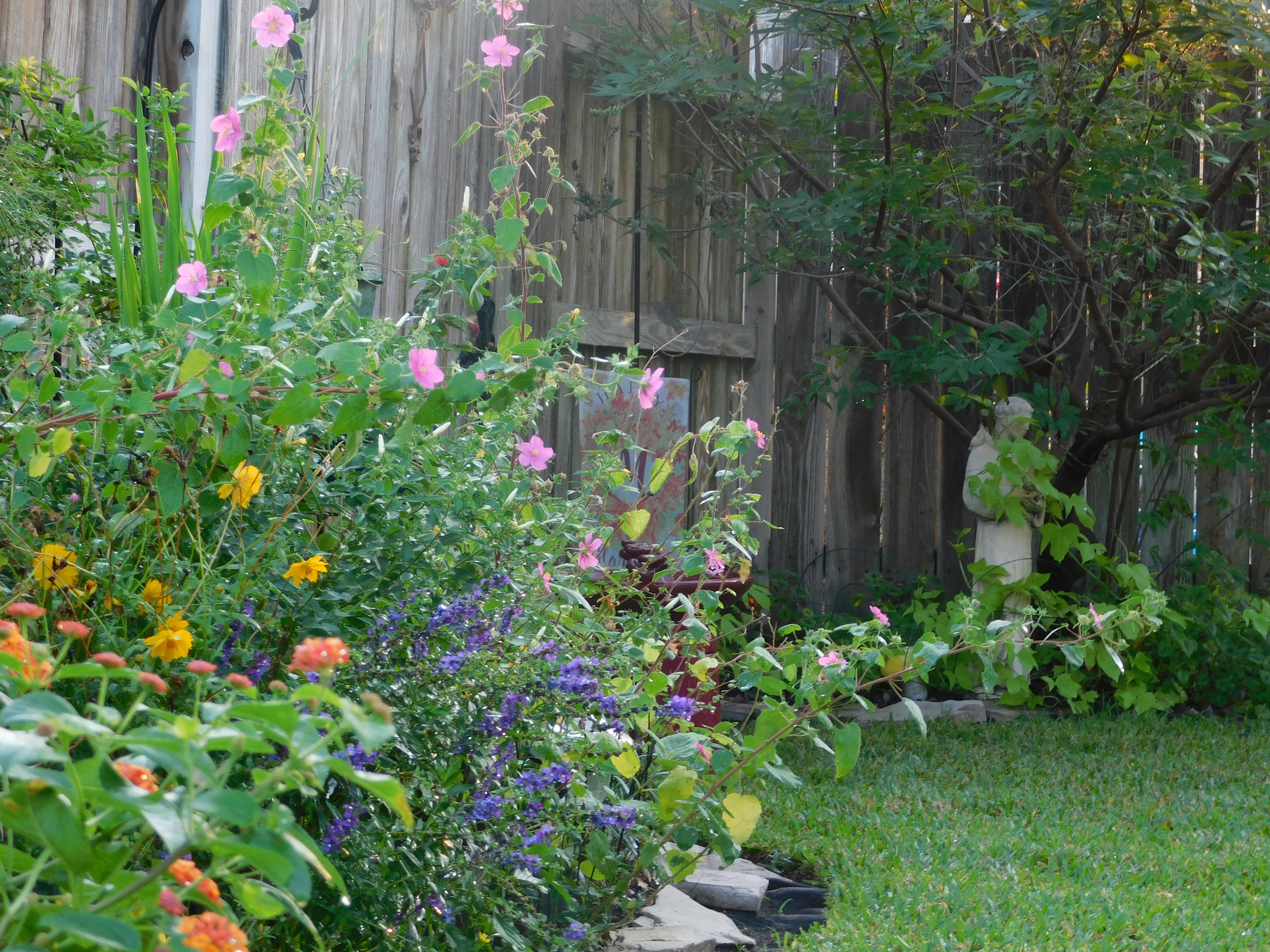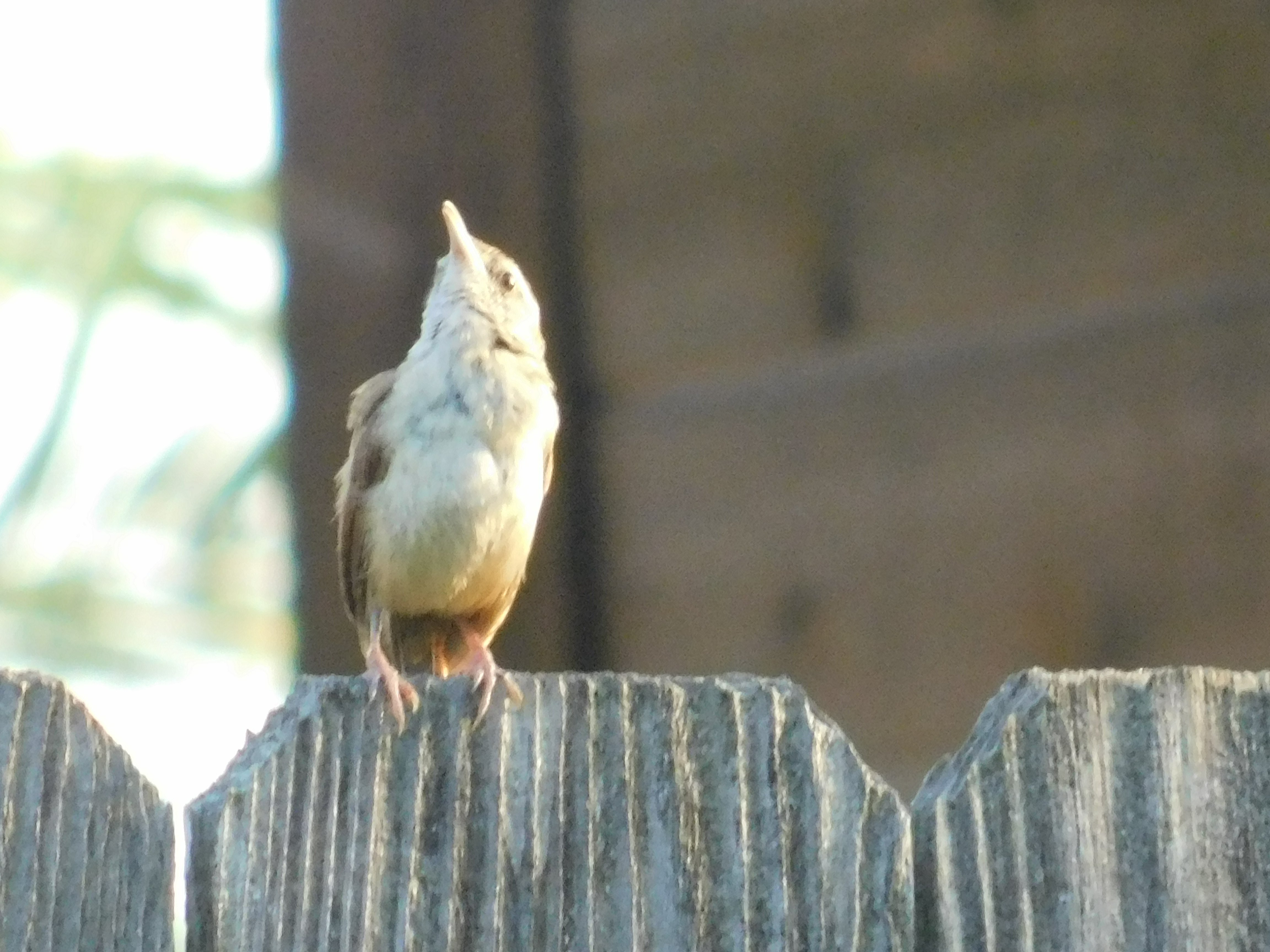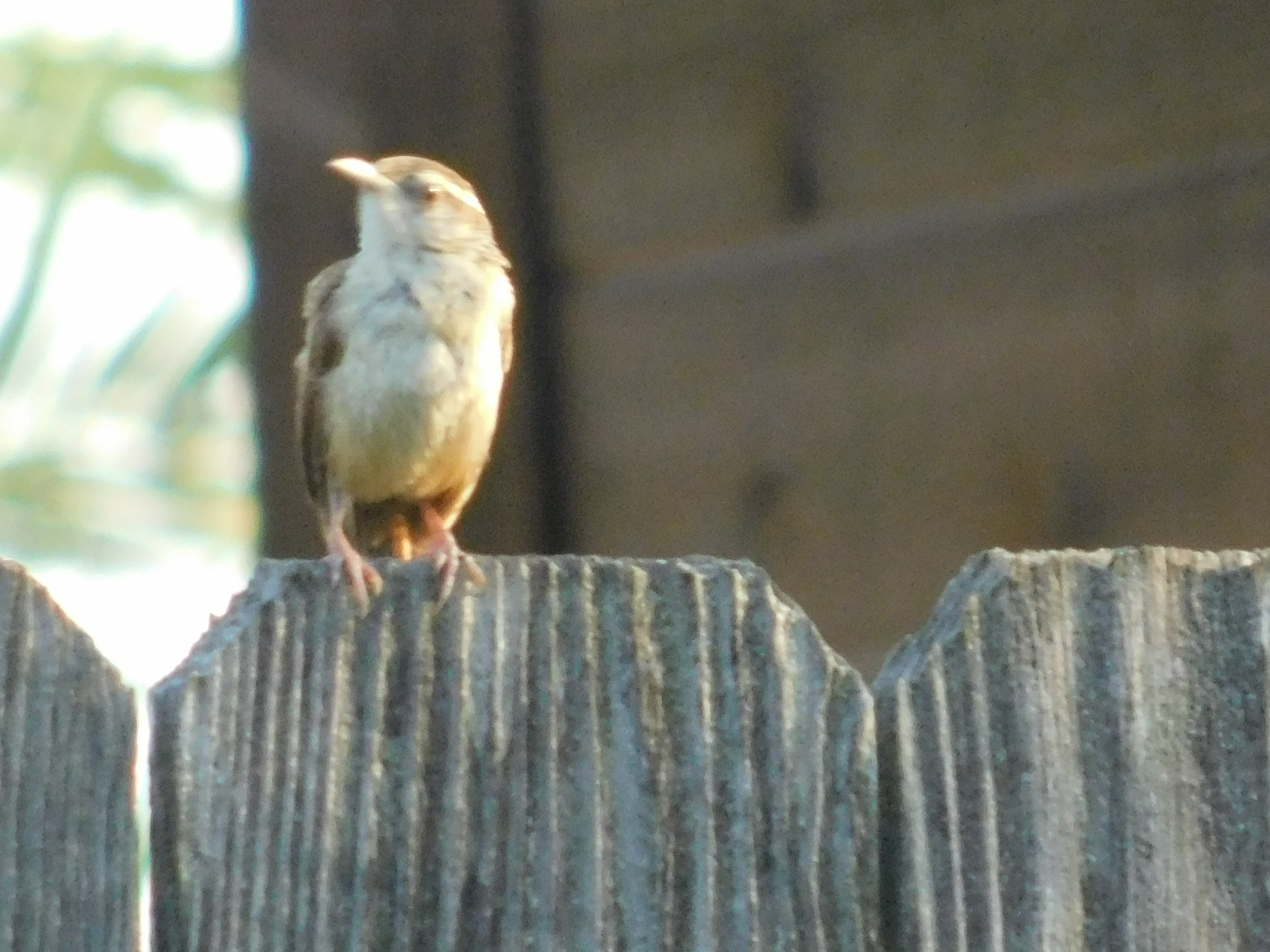 This cute Wren visits the backyard every morning. I can hear his sweet song before I even go outside. He is a gregarious singer and hops about on top of the fence in utter joy. He doesn’t stay still very much of the time, so I have a hard time getting a good photo of him. Nevertheless, he is a frequent visitor to the backyard, and his “Cheeburger-Cheeburger” song is very recognizable. Occasionally, he visits the flower pots on the back porch. This morning, he startled me as I was going back into the house from filling the bird feeders. He had found his way into the big Fiddle leaf fig plant! He hung around a while after I went inside, then flew back into a flower bed. So cute!