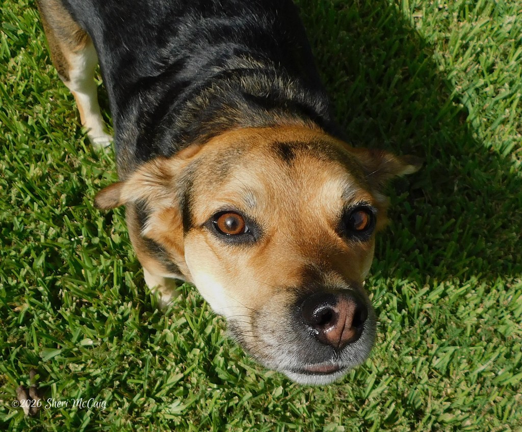This is Elaine, our Beagle mix, rescue pup. She is the sweetest, most anxiety-ridden dog we have ever had. She has evolved to embrace the backyard sanctuary and even likes the walks we take. This picture truly shows her curious and loving nature.
