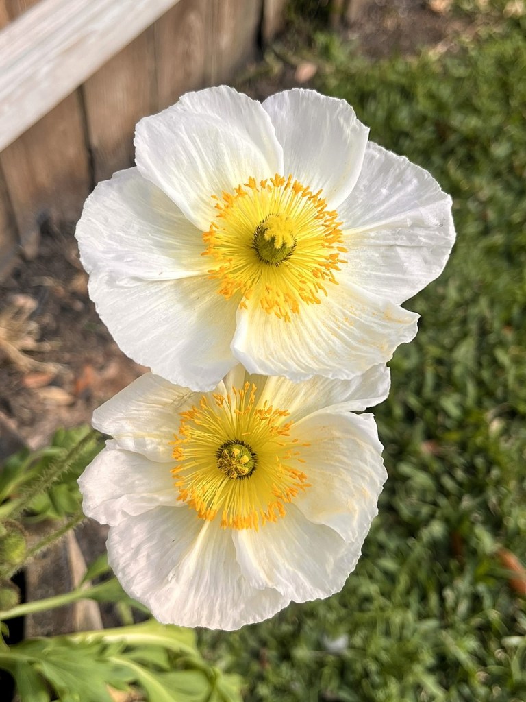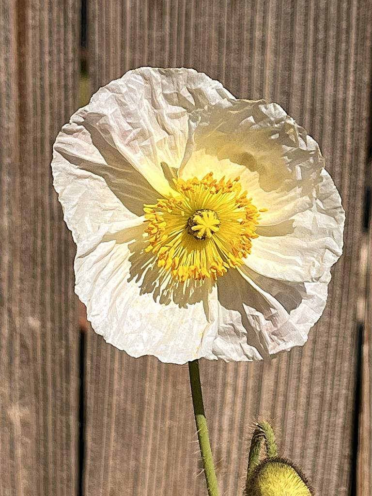 The Poppy plant opened its papery white blooms that followed the sun across the sky.