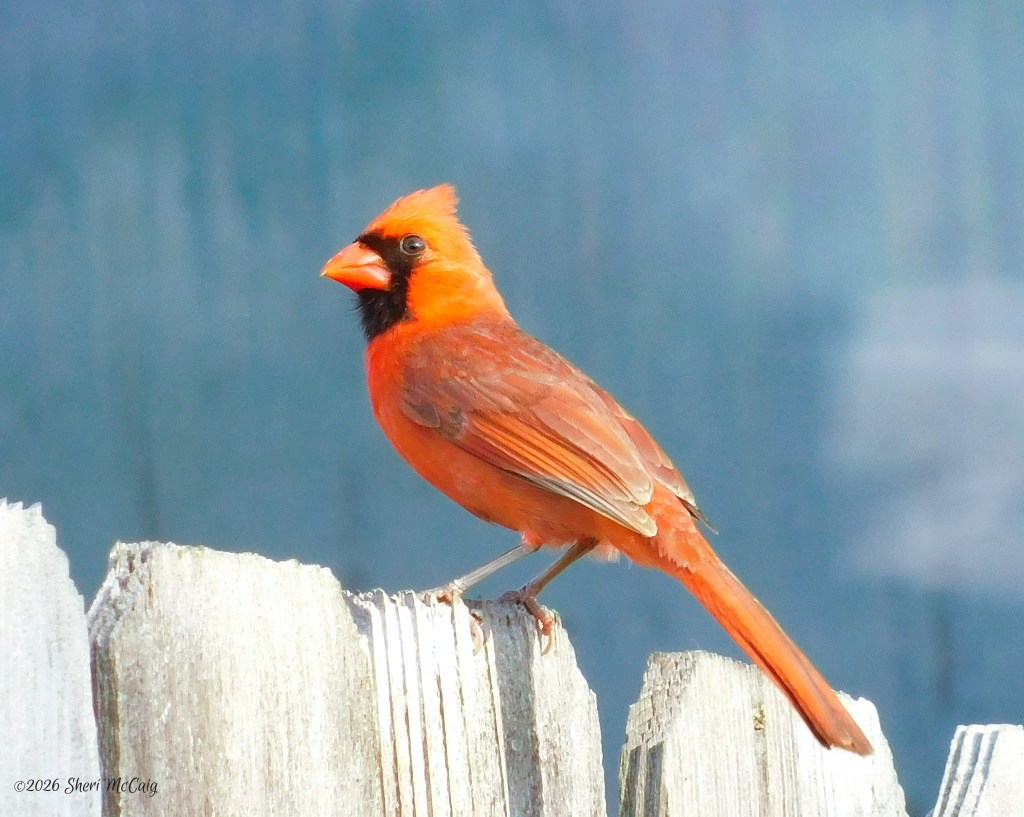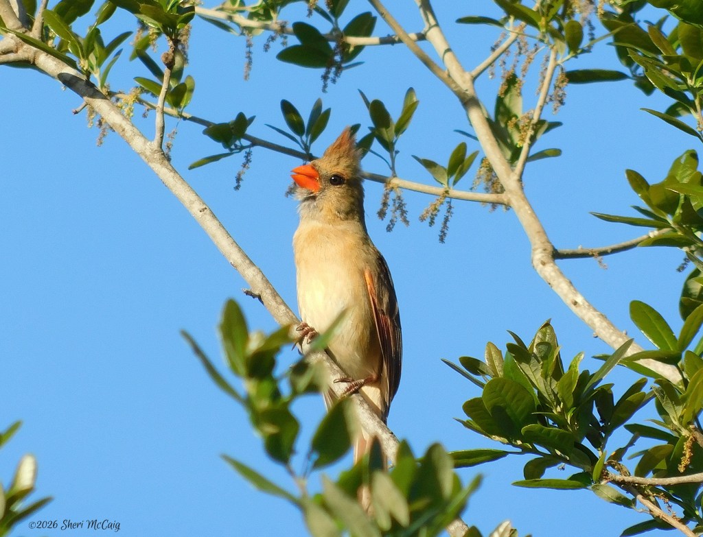 I think the female is so beautiful with the blue sky in the background and the oak leaves surrounding her. Cardinals are just magical!