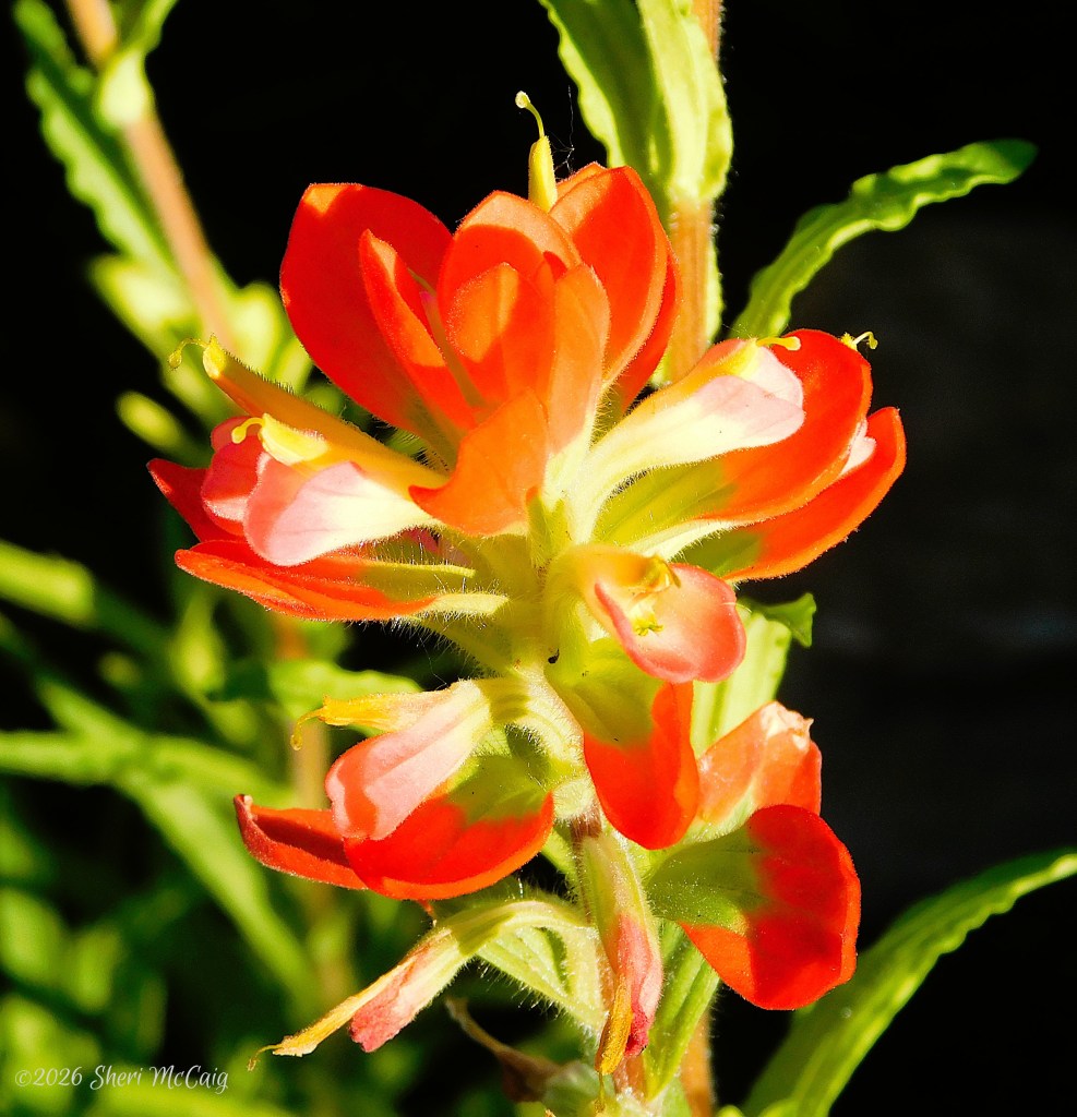 I found Indian Paintbrush, also called a painted cup for its showy cup-like bracts, at a local nursery. I had never seen Paintbrush seedlings or seeds for sale before. Bluebonnets are regulars at the nurseries, but not Paintbrushes. I quickly bought them and put them in the ground. They are doing beautifully. I love how this bloom looks against the dark background. Striking!