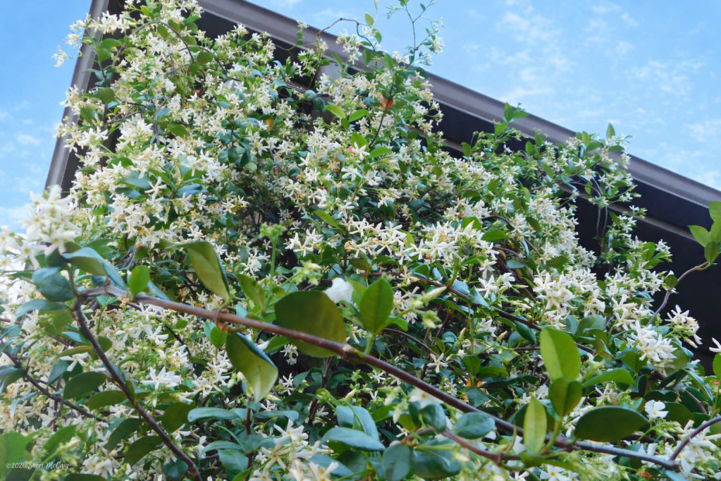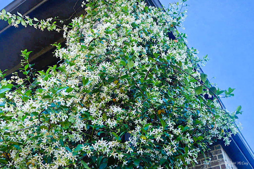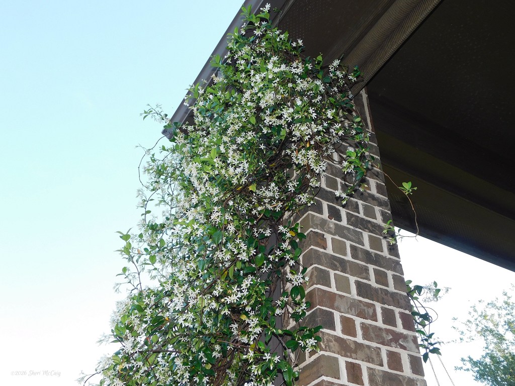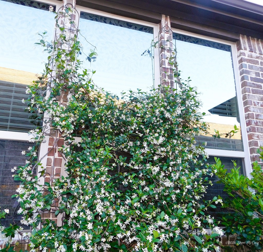 The two Jasmine vines came back strong after the winter. The plant on the column has almost taken over the corner. The Finches built a nest just under the eaves last year, and it was used by several broods. I hope another bird uses the nest this spring. The Jasmine on the window is starting to grow up the trellis. The goal is for the vines to provide shade in this room from the harsh western sun during the hot summer months. The smell as you walk by these vines is just heavenly.