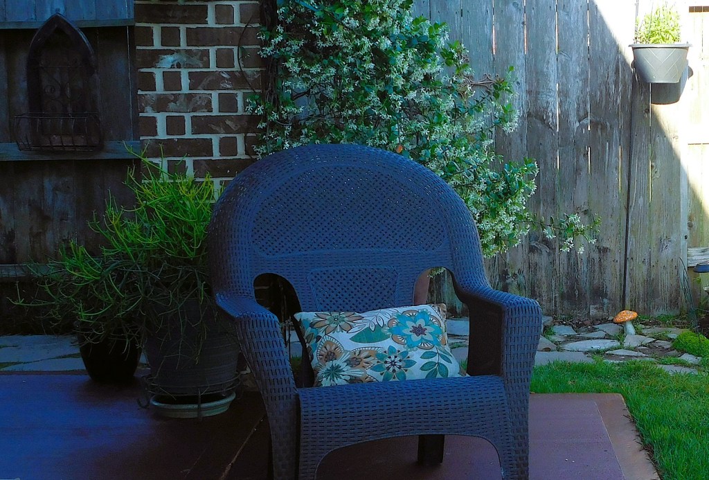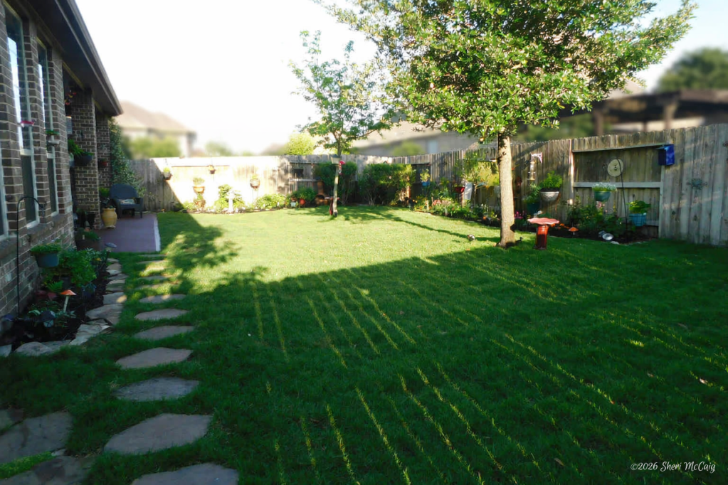 The patio extension and new grass are in, and we have been enjoying them for a couple of weeks. They give the backyard a whole new look. The grass is like a carpet underfoot, and the patio extension covers the area that never gets sunlight.