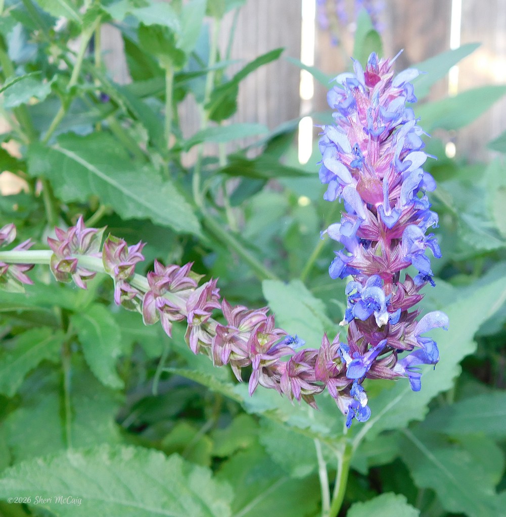The stalk on this purple Salvia is bending toward the sun, also. I planted these seeds two years ago, but the pot was in an area of the yard where it did not get full sun. Needless to say, the plant struggled to survive, much less bloom. This spring, I moved the pot to a full sun location, and it has bloomed nonstop! Gorgeous, big, showy stalks that reach for the sky. I am sure it will be a favorite with the butterflies and hummingbirds.
