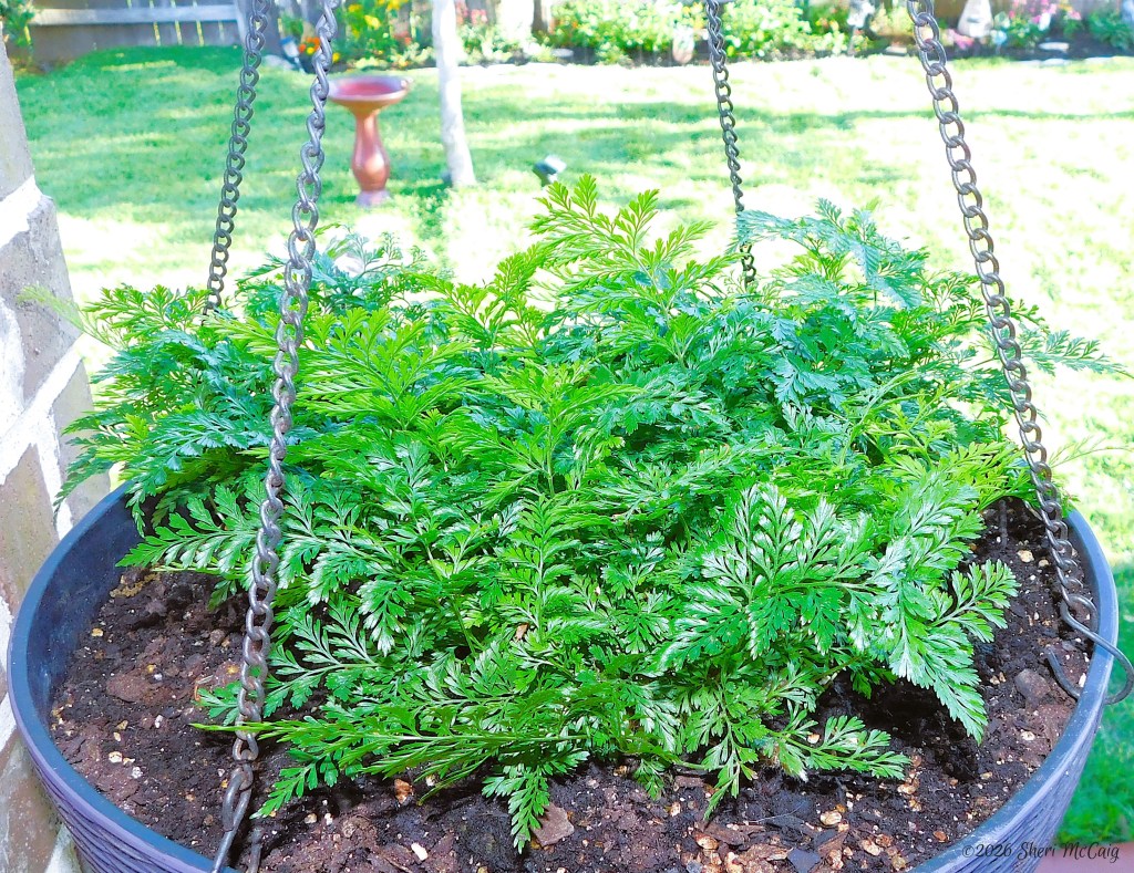 The Rabbit’s Foot Fern is a new addition to the patio. The soft, feathery-like fronds are as soft as a rabbit’s foot, hence the name. The deep green color and gentle way the leaves drape make this a calming addition to the hanging pot group.