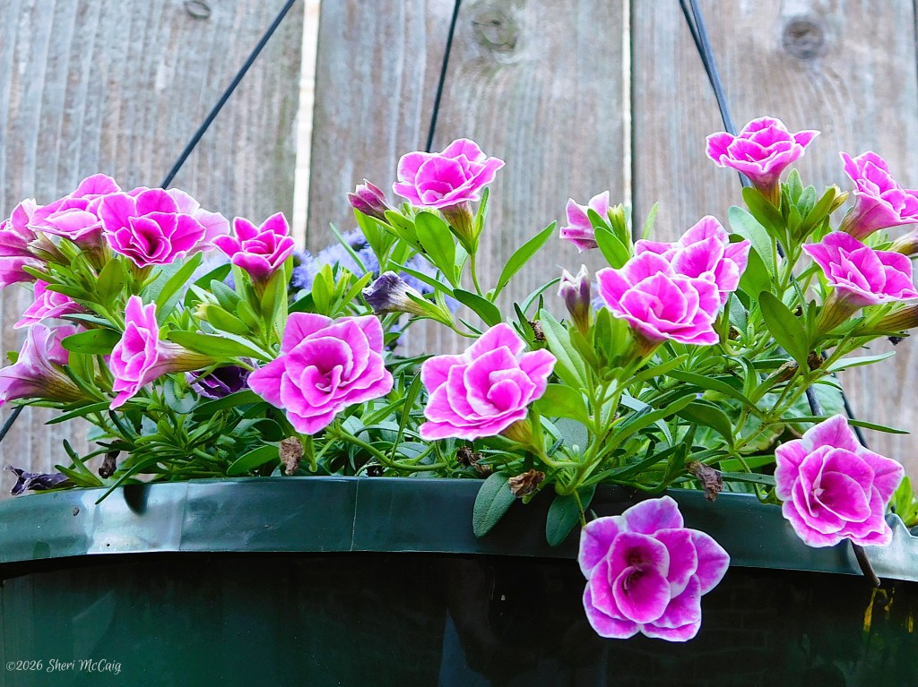 These Trailing Petunias look so happy in the pot with the Ageratum. I love plants that delicately drape over the edge of their container. It is as if they do not want to be contained. These little blooms are peering toward the sun, soaking up all the energy they can.